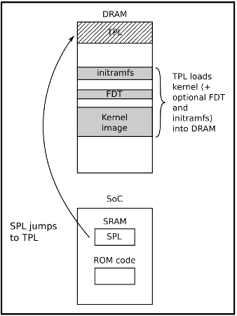 The SPL’s main job is the loading of a TPL (Tertiary Program Loader) into DRAM. Once loaded into DRAM the TPL then takes on where the SPL left off, however this time from Dynamic memory.
