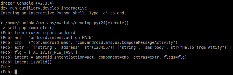 In either case, if you plan on working with Drozer and creating your own modules, I highly recommend installing the mwrlabs.developer module. This module has an interactive shell that you can use to test the creation and interaction of Java objects.