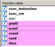 The entry function start calls exec_vm which in turns calls exec_instruction. Apart from this, we can observe calls to time, rand, srand , printf and scanf.