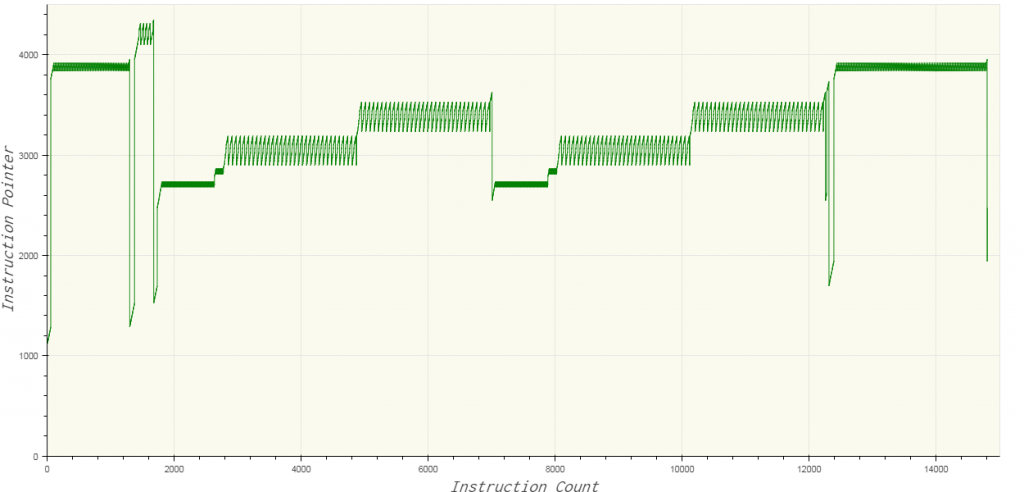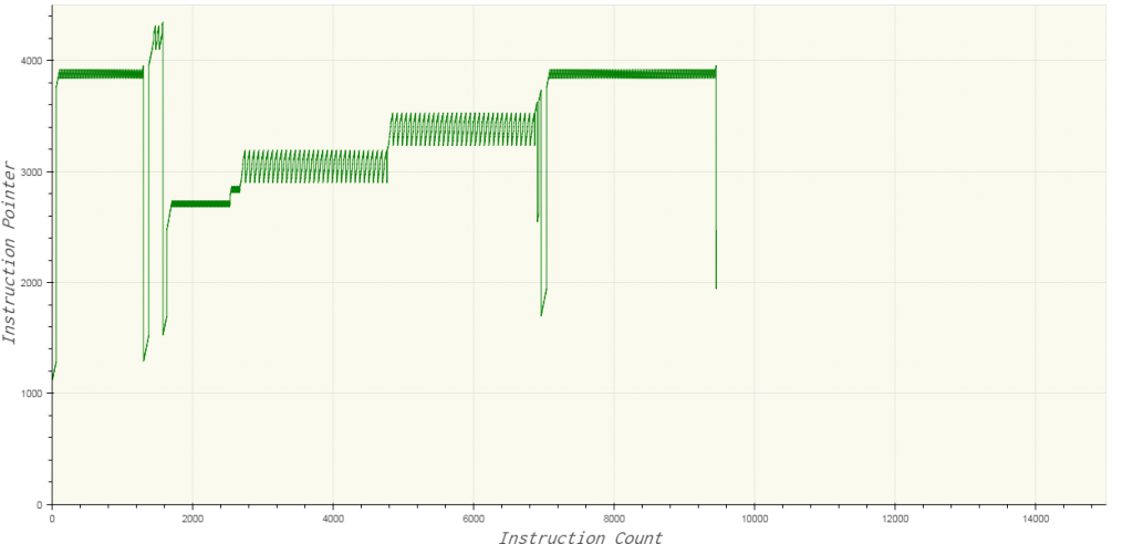 Let us try to get a high-level overview of the password checking algorithm by plotting the value of the instruction pointer during the execution of the VM. To obtain deterministic execution pattern, the random number was replaced with a fixed number 0. Plotting the value of the Instruction Pointer we get the following image when trying with the password “12”.