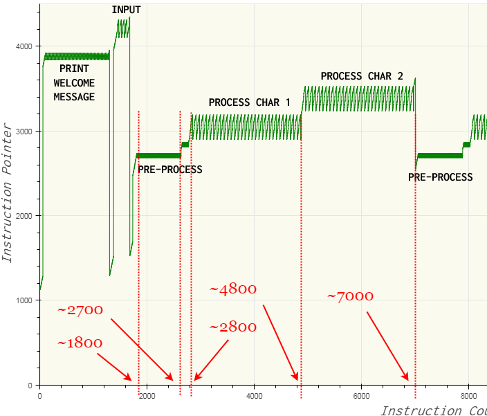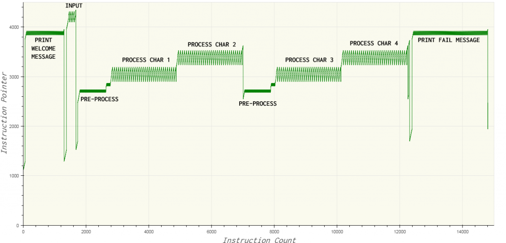The first and last sawtooth patterns indicate the printing of the welcome and failure message respectively. Correspondingly, this means the function which prints a string is located near offset 4000 in the bytecode. The function which handles input is located near 4200. The four peaks in the input pattern correspond to the four-letter password we provided. Characters at odd position in the password are processed near 3000 whereas those at even-numbered position are processed near 3500.