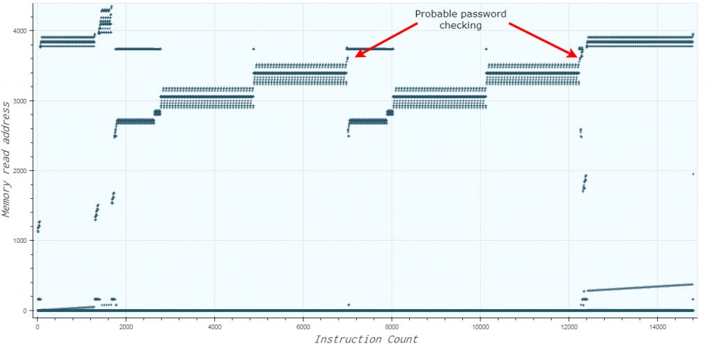 The plot is quite similar to the execution pattern which implies the data and the code that uses it are located close to each other. Memory address 0 has the highest read count suggesting that its used as a temporary variable for storing the results of intermediate calculations. We can reason that the checking algorithm works by performing some calculations on the password characters and comparing the result to a hardcoded value. By intuition, this check seems to be done at the two points marked, close to 3700.