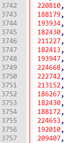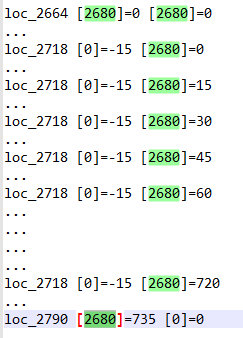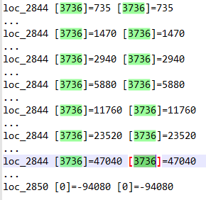 From the memory read plot, we have identified 3700 as the possible location where the result of the previous calculation might be stored. If we inspect the bytecode near offset 3700, we indeed get a list of values.