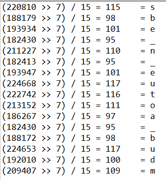In order to get back the initial ASCII values of the letters, we have to reverse the calculation. This can simply be done by right shifting 7 times followed by dividing by 15, i.e. (x >> 7) / 15