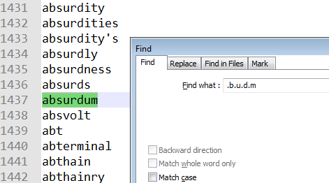 Lets, try to guess the remaining words using this list of English words. We will be using regex search. Searching for .b.u.d.m we get exactly 1 hit – absurdum.