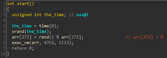 start seeds the random number generator with the current time. arr is an array of DWORDs. A random number modulo 8 is then stored at arr[273]. Lastly, it calls exec_vm passing the array as a parameter. The second argument is the size of the array.