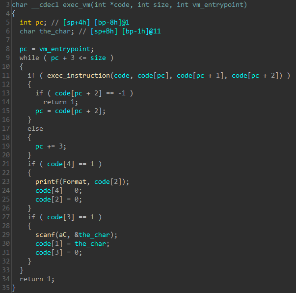 The code fetches three consecutive elements from the array and passes it to the exec_instruction function. The return value decides the next three elements be passed at the next call. All of this is wrapped in a while loop. The experienced eye will immediately recognize this as the dispatch stub used in virtualization based code protection. Let’s have a look at exec_instruction.