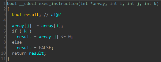 The function subtracts array[i] from array[j] storing the difference back in array[j] . If the third parameter passed is non zero, it returns the comparison of difference <= 0. The virtual machine instruction set comprises of only a single instruction and referred to as One Instruction Set Computer (OSIC). The algorithm implemented is Subleq.