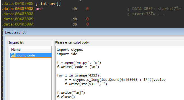The logic is simple enough to be implemented in Python. The bytecode for the VM is located at 403008 and can be extracted using IDA Python.