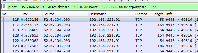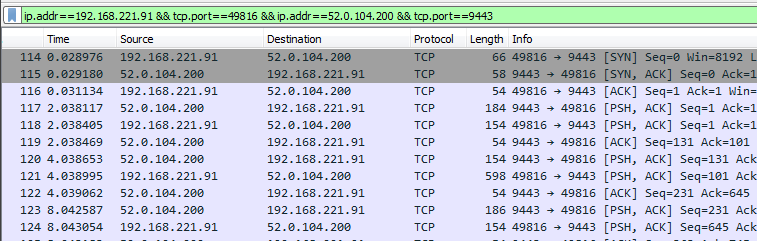 Let’s analyze the second case where it initiates the connection to probably.suspicious.to:9443. Loading the pcap in Wireshark we can see the initial TCP handshake between the host 192.168.221.91 and the server 52.0.104.200