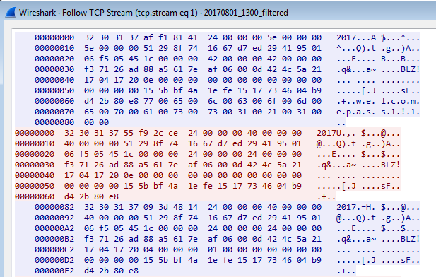 We can see the traffic between the stage2 binary and the Command & Control (C&C) is composed of messages. The parts highlighted in blue are the messages from the C&C to the host while those in red are in the opposite direction, from the host to the C&C. The messages have a well-defined structure and start with the string “2017” which looks to be a part of the header. We can also notice the first message contains the string “welcome”. Before we can proceed we need to understand the protocol – the way these messages are structured. For this, we need to reverse engineer the stage2 binary.
