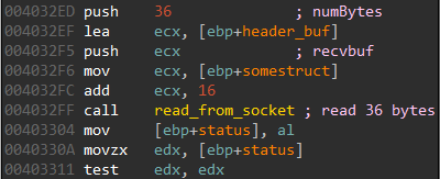 The message consists of a header and the body. The size of the header is included within the header itself. The standard size of the header is at least 36 bytes and begins with the ASCII string “2017”. We can see a call at 4032FF to read 36 bytes from the socket.