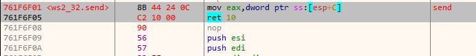 Note, that we are just sending the contents of the file without reading back the response. Naturally, as the malware tries to send responses to us it will fill up the buffer and will eventually block when the send buffer is full. As a workaround, we can patch Ws2_32::send in the debugger to discard all packets sent.