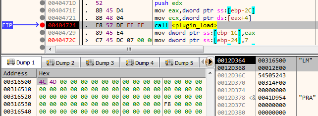 The plugin_load function called from 404724 is responsible for loading a plugin from a buffer. The function takes in two parameters – a pointer to the buffer holding the plugin data, size of the buffer in bytes.