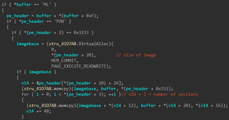 Plugins are DLL files with a modified header so that standard tools are not able to parse it. We can correct the PE headers by analyzing the code which loads the plugin. A relevant decompiled code snippet is provided below.