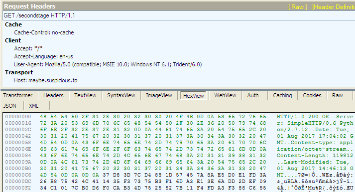 coolprogam is binary compiled in Delphi. Running a quick scan on hybrid-analysis, we can see it tries to connect to a domain probably.suspicious.to. The connection failed anyway. Loading the pcap in Fiddler, we can see a GET request to maybe.suspicious.to/secondstage and the corresponding response.