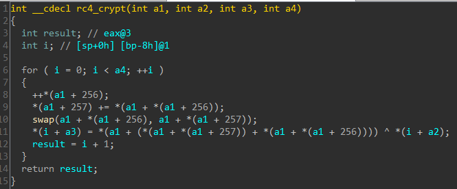 The decompiled code, confirms our assumption that crypto used is RC4.