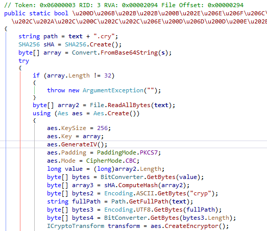 cf.exe is a file encryptor. It’s coded in C# and additionally obfuscated. We can analyze it in dnSpy.
