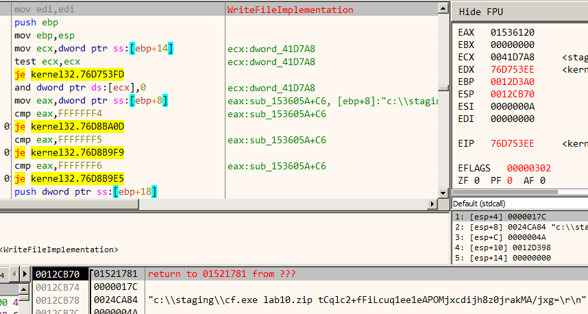 We know cf.exe produces an encrypted file with the cry extension. However, we also need the password used for encryption. If we replay the stage3 traffic and set a breakpoint on WriteFile we can get the cry file password. The same can also be found in the decrypted traffic.