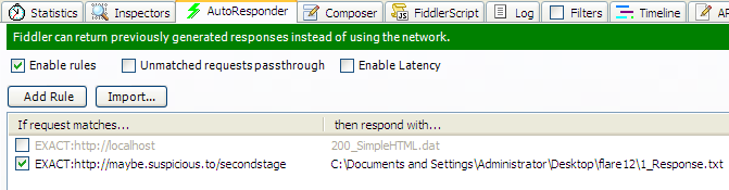 We can create an autoresponder rule in Fiddler to respond with the above message for the URL maybe.suspicious.to/secondstage as shown below.