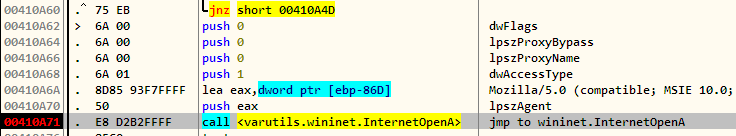 Debugging coolprogram, we can indeed see that InternetOpenA is called with dwAccessType equal to INTERNET_OPEN_TYPE_DIRECT (1) which bypasses any existing proxy.