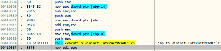 Later down, the program reads the fiddler generated response using InternetReadFile.