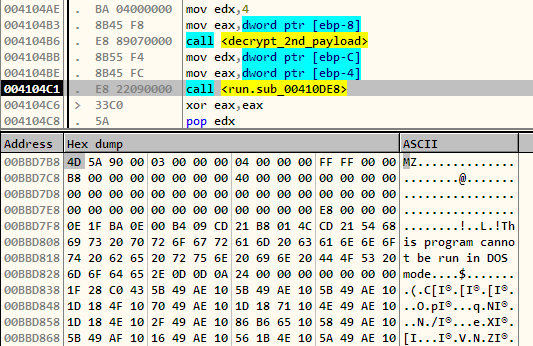 The decrypted response is passed to another function via register edx. We can see the decrypted buffer starts with MZ signalling that this is a PE as well. At this point, we can stop our analysis on coolprogram and proceed with the PE after dumping it from memory. However, it would be worth a while to show how the decrypted PE is processed.