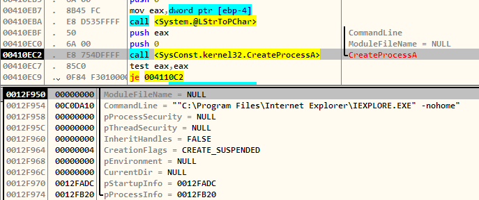 The existing code in the suspended IE process is unmapped. Next, a block of memory is allocated and the decrypted code is copied to it. Finally, after setting the program counter and resuming the suspended process we have a legitimate executable internet explorer running not so legitimate code. This technique is called RunPE or Process Hollowing and is explained greatly here.