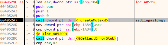 Later down, it tries creates a mutex with the name asdliugasldmgj. If the mutex exists, the malware immediately quits, if not we are good to go. The mutex is thus to keep multiple copies of the malware from running at the same time.