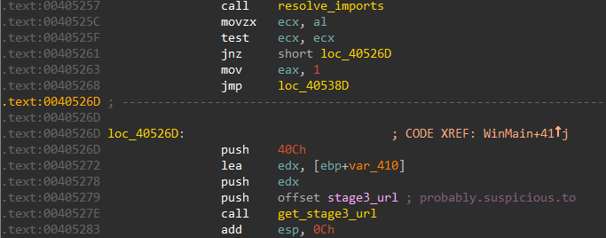 At the start, we have to call to a function (resolve_imports) which as its name suggests uses LoadLibrary and GetProcAddress combination to load the necessary WinAPI function it needs. Next, the malware decrypts a piece of text which looks to be a domain name probably.suspicious.to.