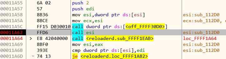 A few lines before it is about to call main we notice an indirect function call through the esi register. Stepping in we discover a hidden function not seen previously.