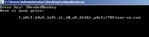 From a cursory look, this does look look like a simple challenge. Running the provided PE file reloaderd.exe prompts for a key.