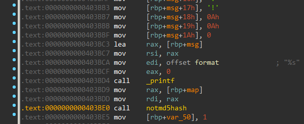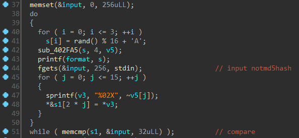 With the above information we can pass the level, however, at the end, the program prompts for a “not md5 hash”. This is more of an annoyance and does not have to do anything with the game. The notmd5hash function is called whenever we complete a level successfully. Inspecting the function which performs this check we can see that our input is compared to an array computed from random numbers.