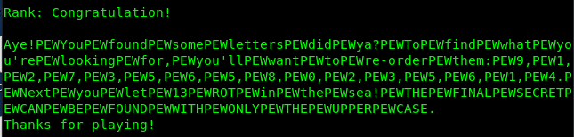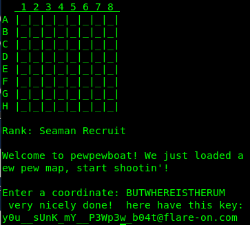 If we look back, we can see the position of the ships represented some english alphabet. The first level resembled “F”. The complete list of characters is “F, H, G, U, Z, R, E, J, V, O”. The message wants us to rearrange the letters and ROT-13 the result. Re-ordering the letters gives OHGJURERVFGUREHZ. Performing a ROT-13 on this results in the string BUTWHEREISTHERUM.