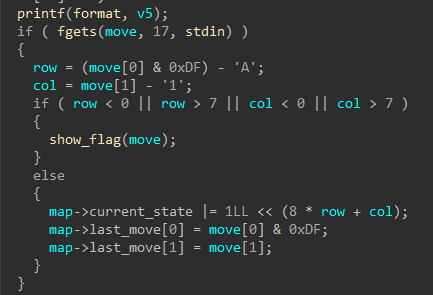 However, this is not the flag for sure. Going back to IDA and inspecting the function which takes the move as input we can see fgets is called with the 17 as an argument. Discarding the line terminator, it means our input can be upto 16 characters long,