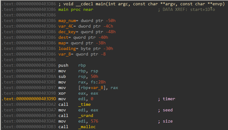 IDA identifies the main function correctly. The program initializes the random number generator via a call to srand . Below that we have a call to malloc requesting 576 bytes of memory. We will see later that these 576 bytes are used for storing the map.