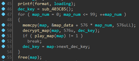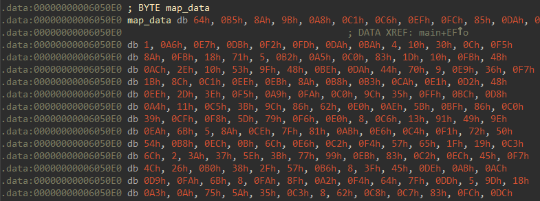 The printf function at line 45 prints the initial “Loading first pew pew map” message. The memcpy call at line 49 copies 576 bytes to the map buffer allocated just before. If we navigate to map_data we can see it is composed of seemingly randomly bytes and probably encrypted.