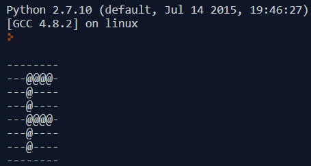 from future import print_function pattern = format(0x0008087808087800, 'b').zfill(64) for i in xrange(len(pattern)-1, -1, -1): if (i+1)%8 == 0: print() if pattern[i] == '1': print('@', end='') else: print('-', end='') print()