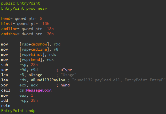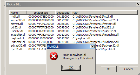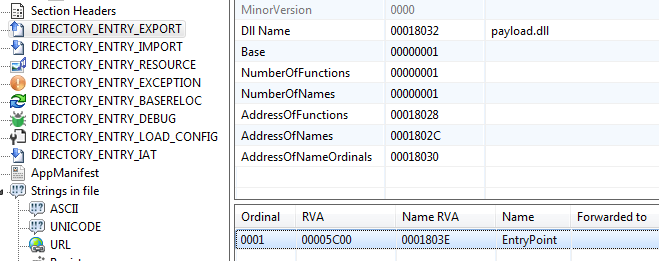 This is strange. There’s is a exported function but we cannot call it by its name. On loading a dll the first piece of code that gets executed is DllMain . It’s possible that DllMain is modifying the export table so by the time we’re ready to call the exported function named EntryPoint it no longer exists.