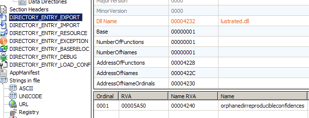 Inspecting the export table of the dumped dll confirms our hypothesis. The said export function no longer exists. Instead there is a new name “orphanedirreproducibleconfidences”. The internal name of the dll also has changed to “lustrated.dll”.