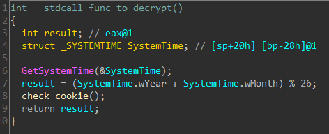 Just below it, func_to_decrypt calculates the value of (year + month) modulo 26.