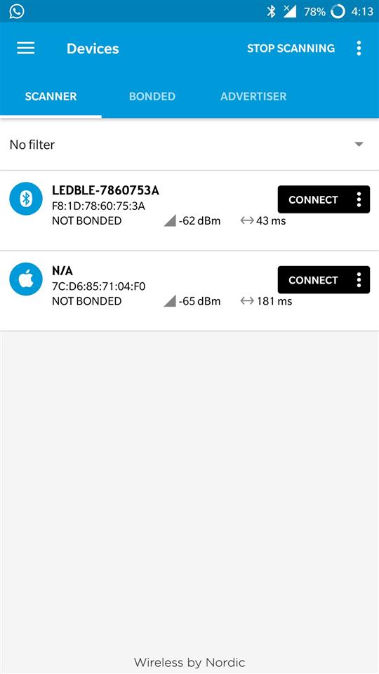 Step 2: Next, download the NRFConnect app from the google play store. Once installed, open up the app, as well as power the Light bulb on. And scan the bulb using nrf connect app.