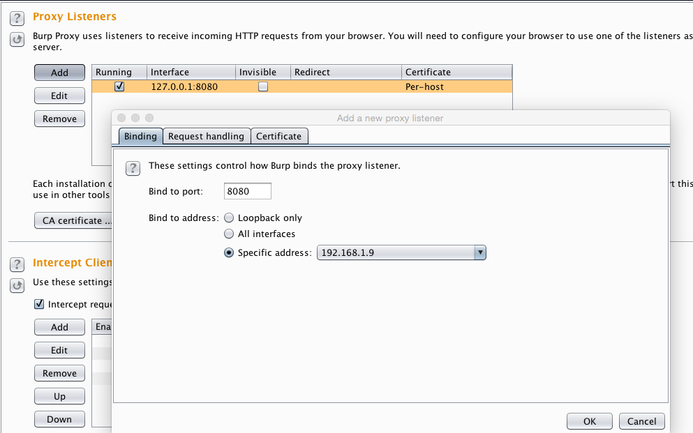 First run the burp proxy on the host machine, then click on **Proxy | Options **and in the Proxy Listener menu item, click on add interface .