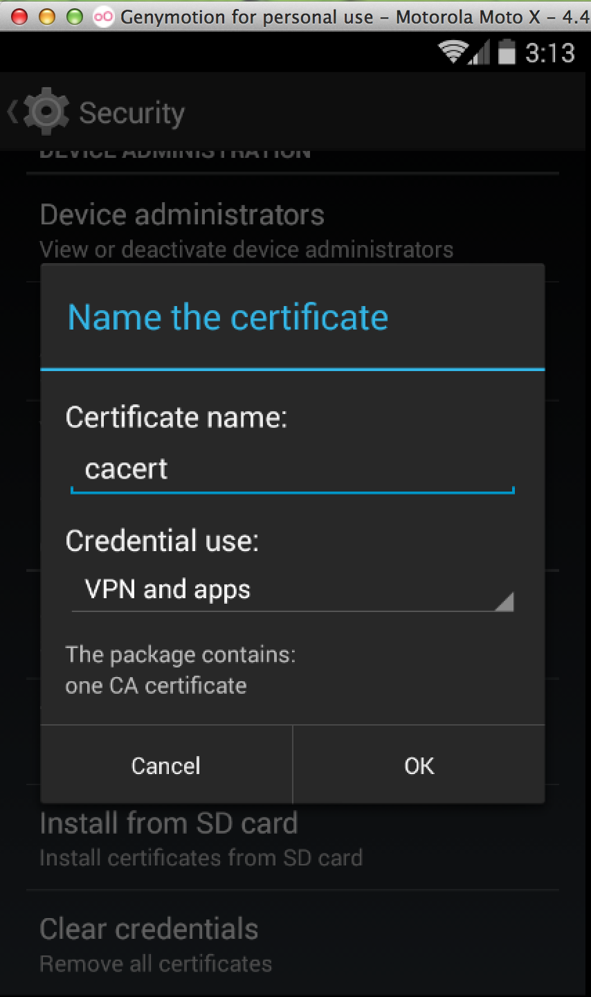 Rename the CA certificate to cacert.crt and push it to the emulator SDCARD using the following commands: