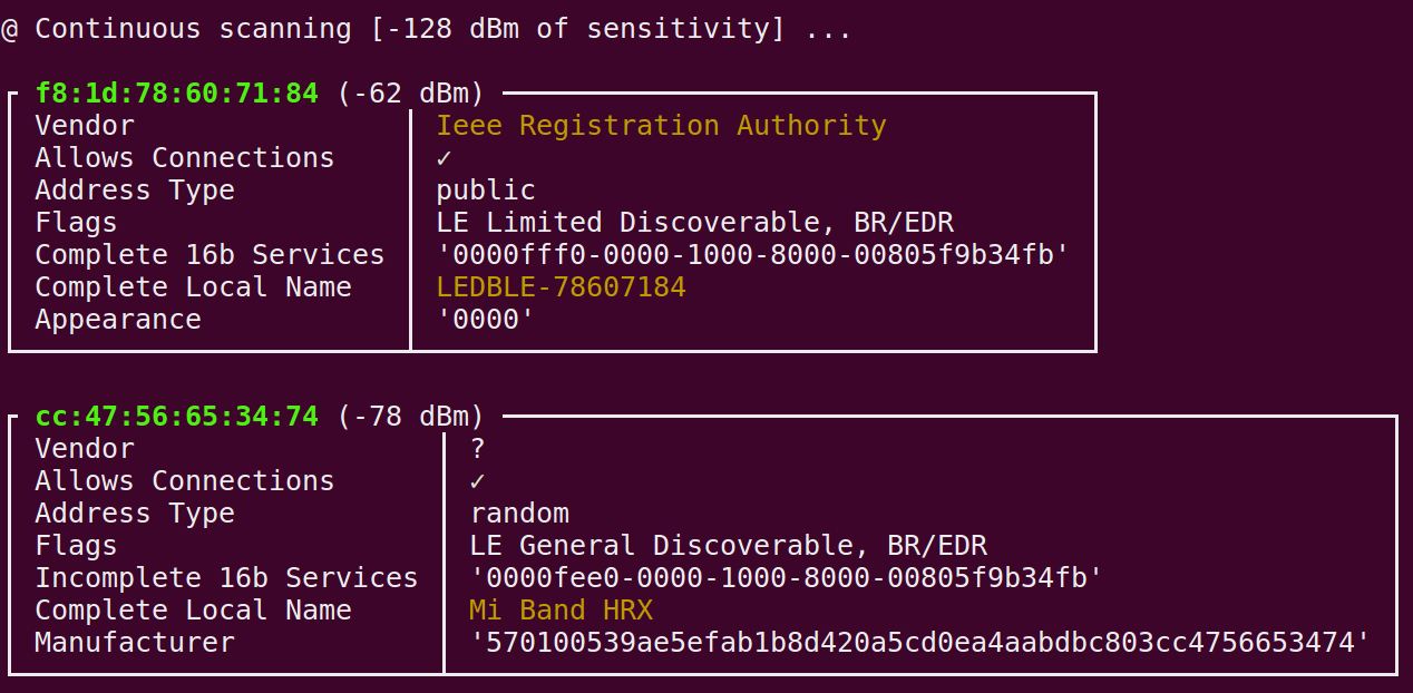 Step 2: Open another terminal and run sudo bleah -t0 where t0 means to scan continuously.