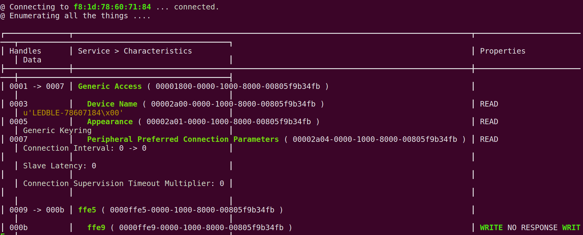 After successful connection, we can see the services and characteristics of the device using the commands.