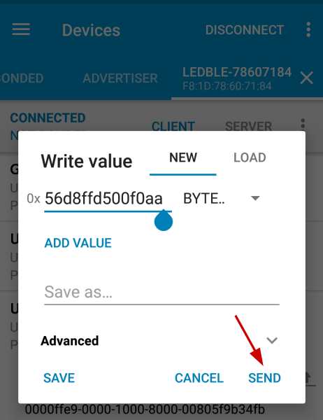 Step 6 : Once connected, write the payload value 56b0306000f0aa. Click on send. The bulb color will change to a shade of burgundy.