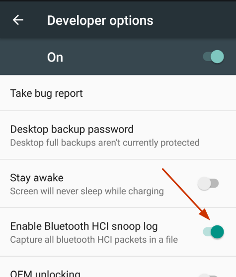 Android starting from version 4.4 onwards has an option to record all bluetooth packets going in/out from the device. To enable capture of bluetooth traffic follow the steps below. Ensure that the android app is installed.