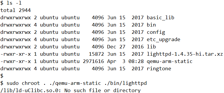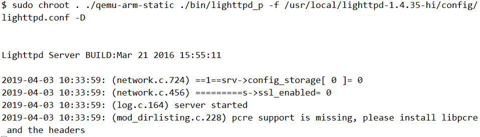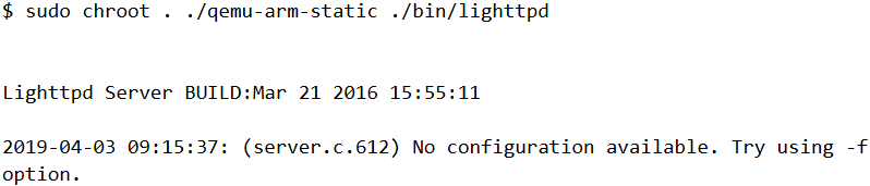 As per the blog post from VDOO, the lighttpd binary is vulnerable to Arbitrary File Deletion. So let’s try running it using qemu.